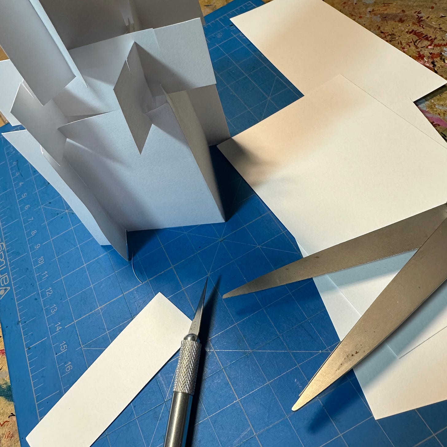 Now that you’ve had some time to explore and experiment, it’s time to begin the challenge. Using the remaining 8 pieces of paper, construct your structure. Use some of the ideas you explored before, but leave yourself open to new ideas as you work. Setting a timer can add another limitation and give you incentive to work faster without overthinking things. Fifteen or twenty minutes is good for this. If you’re using a timer, you might not get to use all 8 of the pieces of paper, and that’s ok.